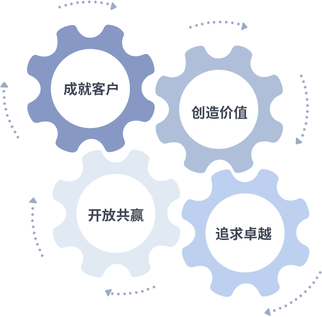 成就客户是一切决策的出发点,,,创造价值是衡量所有工作的标准,,追求卓越是我们做事做人的态度,,,开放共赢是我们的格局也是最终的结果。。。。价值观的齿轮环环相扣,,推动着组织里的每个人不断向前。。。。